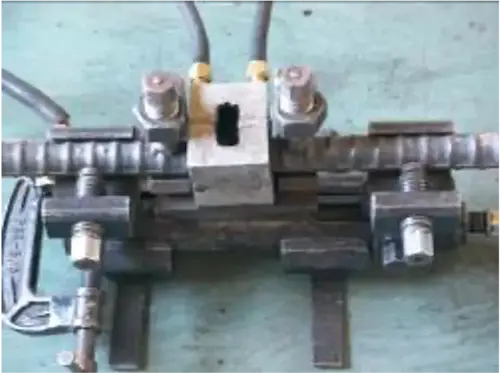 手動ガス圧接は、接合端面を突き合せて、圧力を加えながら、接合部を酸素・アセチレン炎で1200℃~1300℃ に加熱し、接合端面を溶かすことなく赤熱状態でふくらみを作り接合する工法です